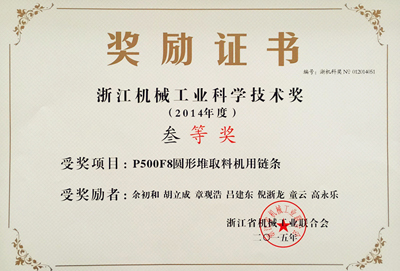 4月23日,浙江省機械工業聯合會四屆二次理事(擴大)會議暨2014年度科學技術獎頒獎大會在杭州召開。會上,浙江機械工業聯合會表彰了52項“2014年度浙江機械工業科學技術獎”獎勵項目。由東華集團技術中心組織申報、集團所屬杭州自強鏈傳動有限公司工程鏈事業部為主研發的“P500F8圓形堆取料機用鏈條”高端產品項目榮獲三等獎,這是東華集團的產品創新項目連續三年榮獲浙江省機械工業科學技術獎,也是2014年度全省諸多機械產品中唯一一項鏈傳動產品開發項目獲獎。