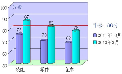 開(kāi)展檢查評(píng)比,落實(shí)持續(xù)改善 事業(yè)部不定期對(duì)各部門的改善活動(dòng)進(jìn)行檢查評(píng)價(jià),每月至少2次,覆蓋所有單位區(qū)域,通過(guò)TPS專員和組員的聯(lián)合檢查評(píng)價(jià),利用《5S評(píng)分表》進(jìn)行打分排名并對(duì)改善滯后的員工進(jìn)行再培訓(xùn)并達(dá)到標(biāo)準(zhǔn),對(duì)活動(dòng)開(kāi)展積極,效果明顯的進(jìn)行獎(jiǎng)勵(lì),激勵(lì)各單位持續(xù)做好改善工作。檢查評(píng)比把重點(diǎn)放在現(xiàn)場(chǎng)的掌握上,通過(guò)現(xiàn)場(chǎng)檢查發(fā)現(xiàn)的問(wèn)題被納入事業(yè)部5S、TPS 的改善對(duì)象,列入改善計(jì)劃,落實(shí)具體改善措施,整個(gè)活動(dòng)基本進(jìn)入“有檢查、有措施、有落實(shí)”的良性循環(huán)。目前現(xiàn)場(chǎng)整體效果良好,基本實(shí)現(xiàn)了現(xiàn)場(chǎng)清爽、分類清楚、定置有序的目標(biāo),進(jìn)一步提升了現(xiàn)場(chǎng)可視化效果。