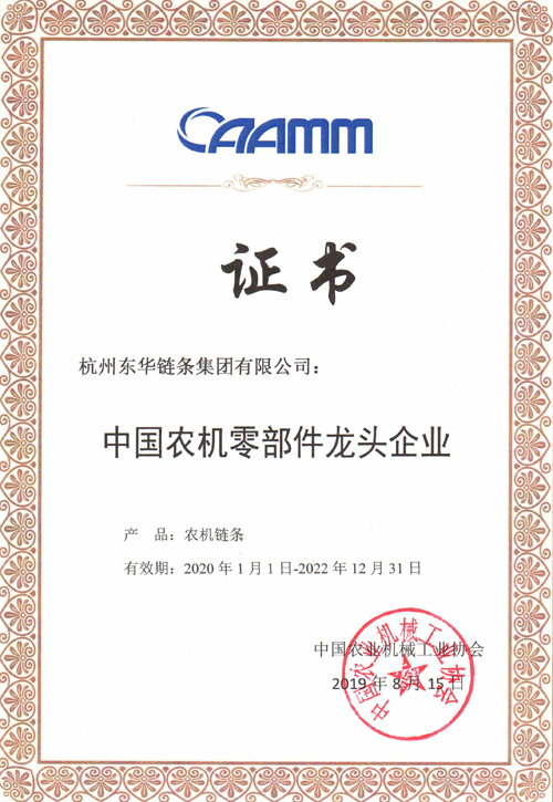 中國農機工業協會從2013年開始,每三年一次組織眾多農機行業的知名專家,根據企業的生產經營規模、市場占有率、品牌影響力等要素,評選出具有行業代表性的優秀龍頭企業。東華鏈條分別于2013年、2016年、2019年連續三屆被授予“中國農機零部件龍頭企業”稱號,該殊榮是中國農機工業協會打造的行業品牌榮譽,也是中國農機零部件企業的金名片。