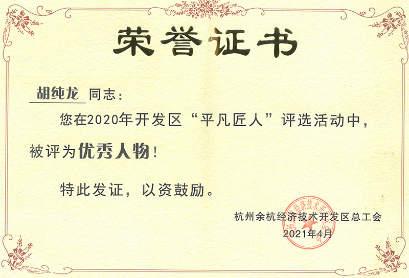 繽紛四月,東華鏈條集團(tuán)傳動(dòng)鏈?zhǔn)聵I(yè)部員工胡純龍被余杭經(jīng)濟(jì)技術(shù)開(kāi)發(fā)區(qū)總工會(huì)授予2020年“平凡匠人”稱(chēng)號(hào),這又是一次對(duì)他在平凡崗位上做出不平凡工作的認(rèn)可!