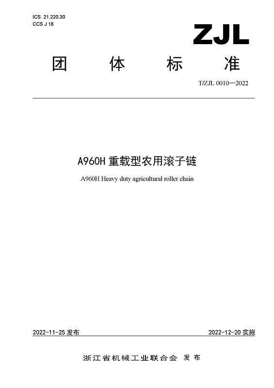 近日,浙江省機械工業(yè)聯(lián)合會批準、發(fā)布團體標準T/ZJL 0010—2022《A960H重載型農(nóng)用滾子鏈》(以下簡稱《A960H鏈條》),自12月20日起實施。這項浙機聯(lián)團體標準由東華牽頭負責制定,東風農(nóng)機集團等4家單位參加起草。《A960H鏈條》標準規(guī)定了適用于在各類農(nóng)作物作業(yè)機械上使用的A960H重載型農(nóng)用滾子鏈的主要參數(shù)和尺寸、技術要求、試驗方法、檢驗規(guī)則等要求。