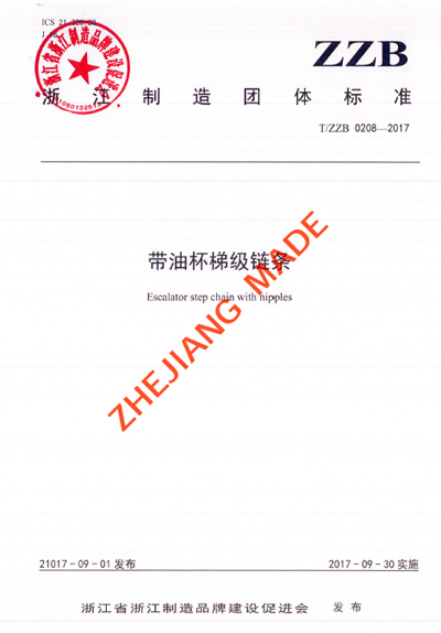 日前,浙江省浙江制造品牌建設(shè)促進(jìn)會印發(fā)“浙促會標(biāo)發(fā)[2017]43號”文件,批準(zhǔn)發(fā)布由浙江藍(lán)箭萬幫標(biāo)準(zhǔn)技術(shù)有限公司牽頭組織制訂、杭州東華鏈條集團(tuán)有限公司負(fù)責(zé)起草(主導(dǎo)制訂)的“浙江制造”團(tuán)體標(biāo)準(zhǔn)T/ZZB 0208—2017《帶油杯梯級鏈條》。